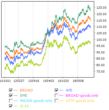 역사적으로 1998년 이후 2018년까지 Major, OITP 지수는 상품교역만 사용되었던데 반해, AFE와 EME는 상품과 서비스 무역도 포함