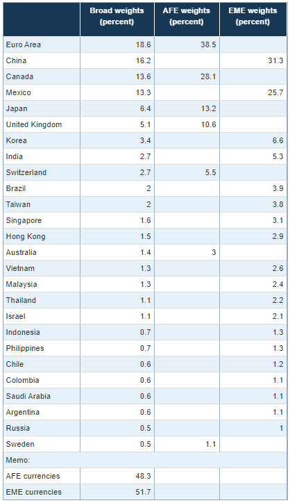 2017년 미국의 서비스 수출이 34%, 서비스 수입이 19%에 달해 서비스 무역의 중요성이 증가함에 따라 2019년부터 서비스 무역을 포함한 가중치가 구축되었습니다. 또한 베트남의 무역 점유율은 1.2%로 기준치인 0.5%를 넘고 있어 베트남을 추가시켰고 베네수엘라는 0.2%를 하회하여 제외시켰습니다. 이러한 지수구축 변경을 통하여 Broad 지수에 포함된 26개 통화는 전체 미국과의 양자무역의 90%를 차지하고 있습니다.