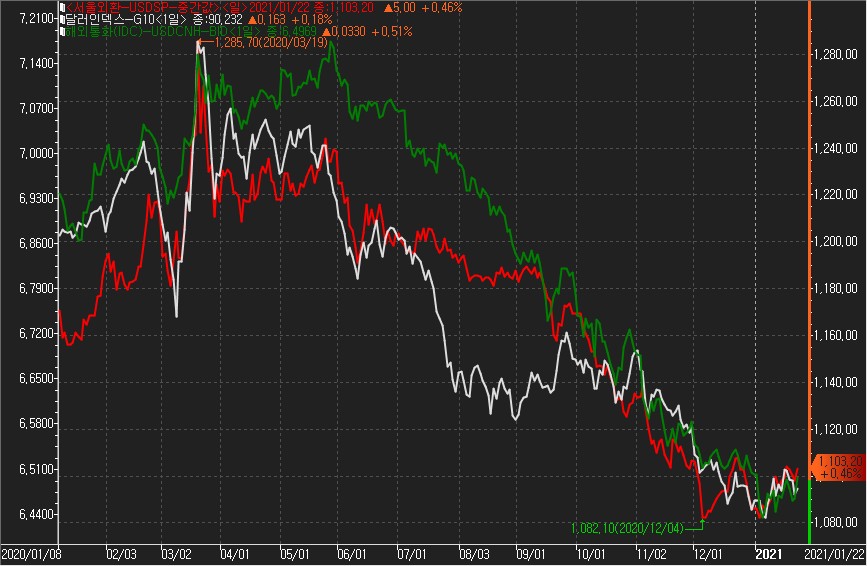 달러원 환율은 1100원 내외에서 FOMC 결과 전까지는 월말 네고물량에 상단이 막히며 제한된 흐름을 보일 것으로 전망됩니다. (아래 그림파일은 원화(빨), 달러(흰), 위안(녹) 차트입니다.)