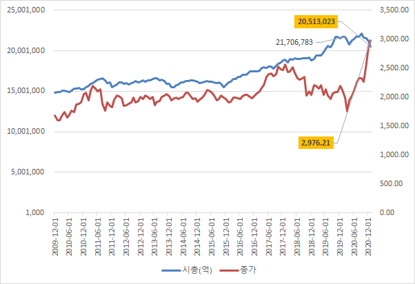 코스피 지수는 지난해 코로나19위기로 큰 폭의 하락이 있었어도 시가총액은 잘 유지가 되었었네요.
