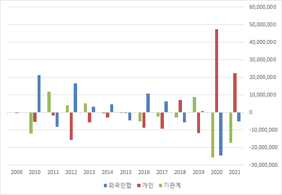 이번 포스팅은 1월 투자자별 매매동향과 2010년 이후 투자자별(개인, 외국인, 기관) 월별 순매수 누적차트를 살펴보도록 하겠습니다.