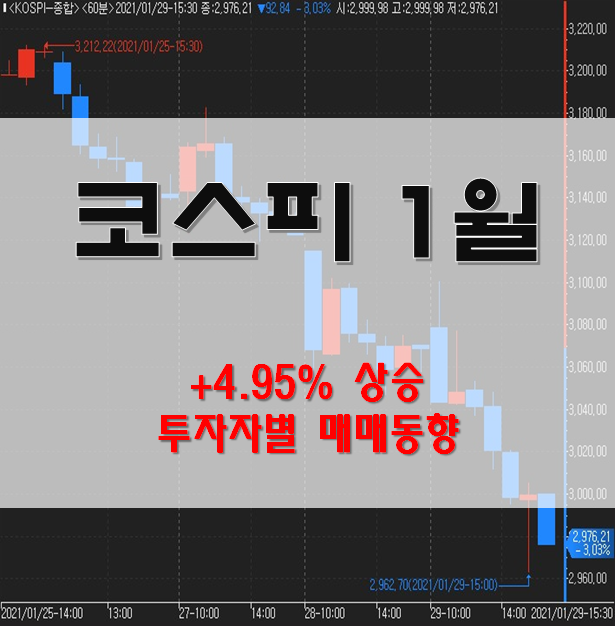 코스피 21년 1월 마감. 투자자별 매매동향 2,976.21p 전월대비 4.95% 상승