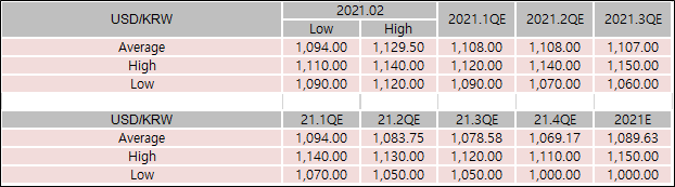 국내기관들은 2021년 저점과 고점이 1060~1150원 범위에 형성되어 있으며
