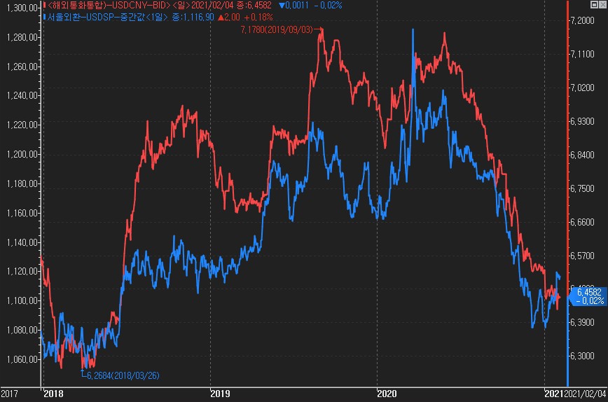 최근 몇 년간 미중간 무역분쟁과 환율조작국 이슈, 중국 내수진작을 위한 쌍순환정책 등에서 위안화의 일부 절상이 용인된 흐름으로 6.4~6.5위안대 거래되고 있습니다.
