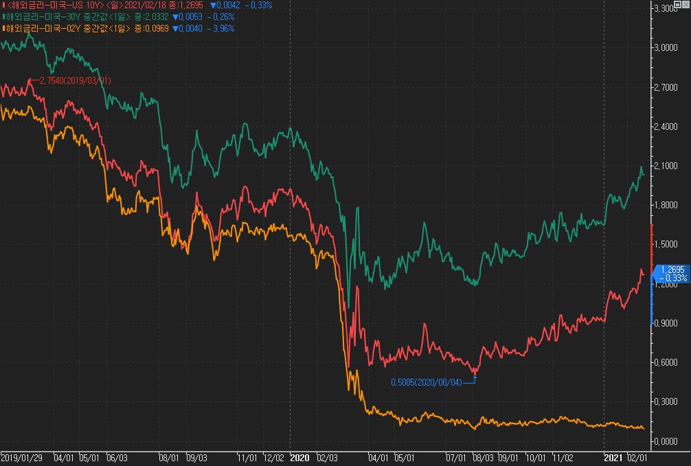 최근 미10년물 국채금리가 1.30%, 30년물 국채금리는 2.09%에 다다르자 빠른경기회복과 인플레 우려가 시장에 번지고 있습니다.