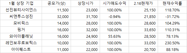 1월 상장기업들의 경우 씨앤투스성진을 제외한 기업들은 상장일 시가가 공모가 대비 55.63~100%의 시가를 형성하였고, 2.16일 기준 수익률은 -31.72%~230.50%로 기업차별화가 더 크게 난 것으로 보여집니다. (2019년, 2020년 상장사들 분석도 해보았습니다.)