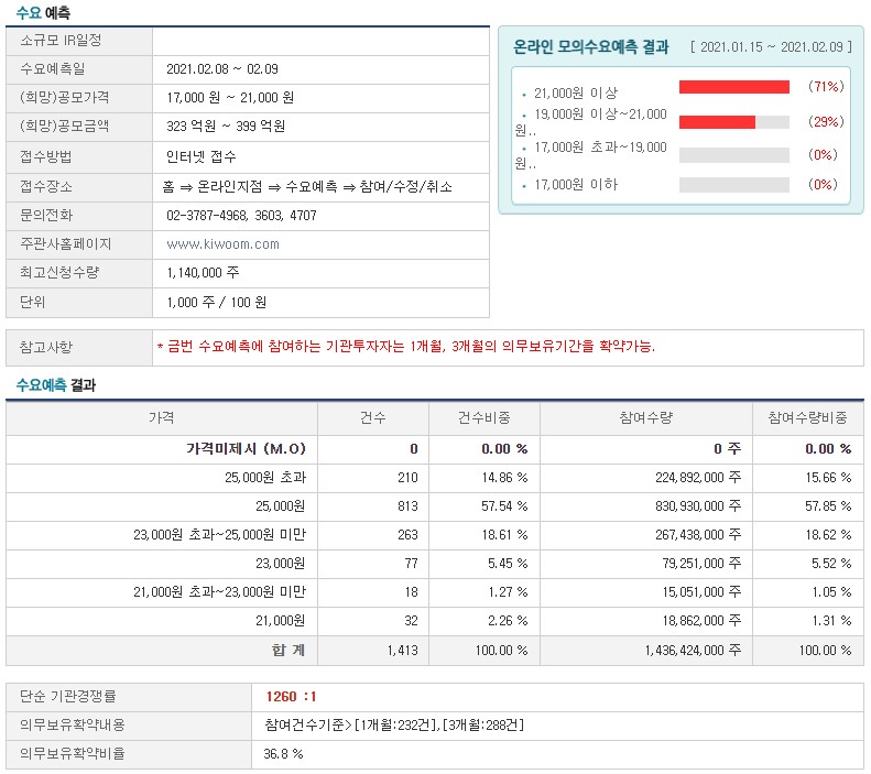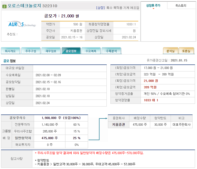 * 키움증권이 주관사로 475,000주 배정. 비례 237,500주 : 균등 237,500주 배정