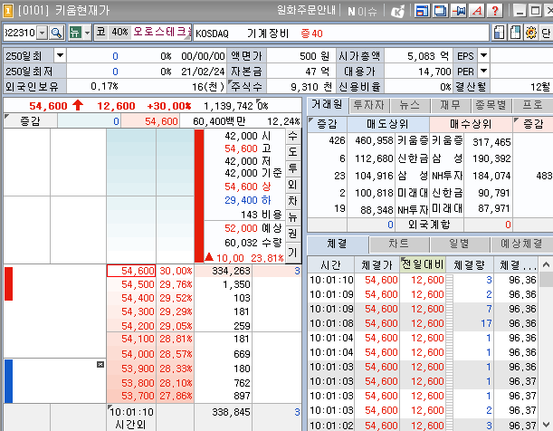 1시간동안 정적VI가 두번 발동되며 50,000~54,600원 사이 호가되다 10시 이후로 30만주의 상한가 매수잔량으로 상한가를 만들고 있습니다.