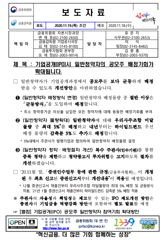 금융위원회에서 금번 공모주 배정방식을 변경하여 많은 소액투자자들에게도 청약의 기회를 제공하고자 하는 것이 많은 분들에게 도움이 될 것 같습니다.