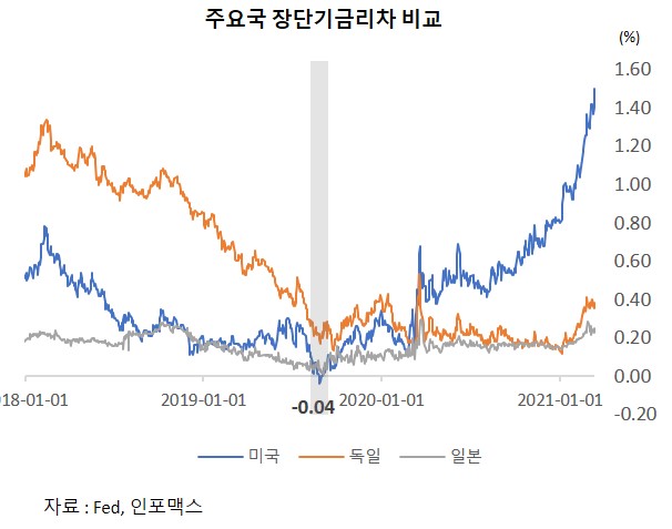 주요국 중 미국이 코로나19백신보급과 경기회복에 있어서 독일, 일본 대비 호조를 보이고 있어 장단기 금리차 스프레드가 급등하고 있는 상황입니다. 이에 외환시장에서도 이를 반영하며 달러강세로 나타나고 있는 것으로 판단됩니다.