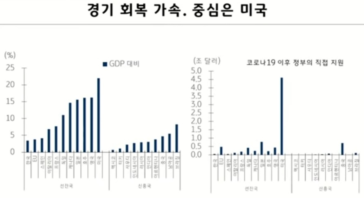 최근 가팔랐던 달러강세가 다소 완화되는 모습이지만, 코로나이후 4.5조달러의 대규모 부양책으로 경기회복세를 이끌고 있어 유럽, 일본 등 주요국대비 높은 경제성장률을 보일 것으로 예상됩니다. 이는 곧 원화의 약세요인이지만 원화 자체의 내구도가 높아지고 있는 상황으로 여타 신흥국과는 다른 흐름을 보일 것으로 전망하고 있습니다.
