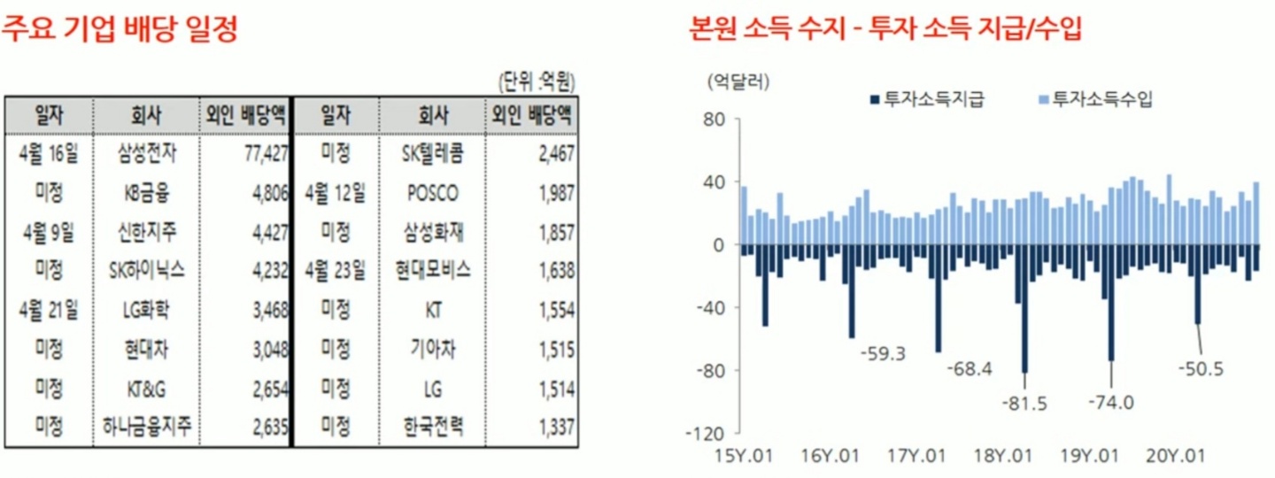 4월은 외국인 배당이 삼성전자의 특별배당으로 사상최대치인 130억불 가량 지급될 것으로 보여집니다. 2019년 74억불, 2020년 50억불대비 두배수준으로 외환시장에 미치는 영향력을 주목해야할 것으로 보여집니다.