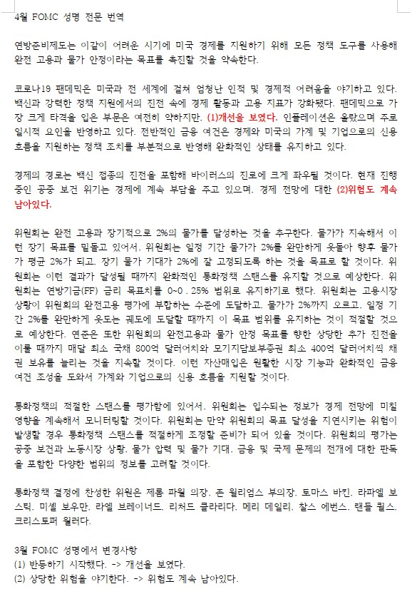 기준금리는 동결하였고 지난 3월 FOMC와 달라진 점은 아래 그림파일 4월 FOMC 전문에 자세히 표시해놨습니다. 연준은 물가상승이 일시적 요인이라는 점을 강조하였는데요. 연준이 경제에 대한 낙관적인 전망을 이어간 것으로 판단됩니다.