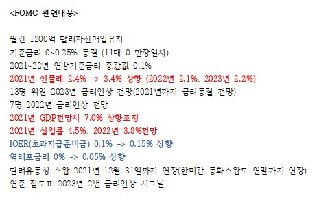 전일 FOMC에서 성명서 문구변화는 없었으나 파월연준의장이 기자회견에서 "최근 인플레이션이 눈에 띄게 상승했다며" "인플레이션이 지속된다면 이에 대처하기 위해 통화정책을 쓸 것"이라며 연준이 자산 매입 테이퍼링에 대해 논의했다고 인정하였습니다.