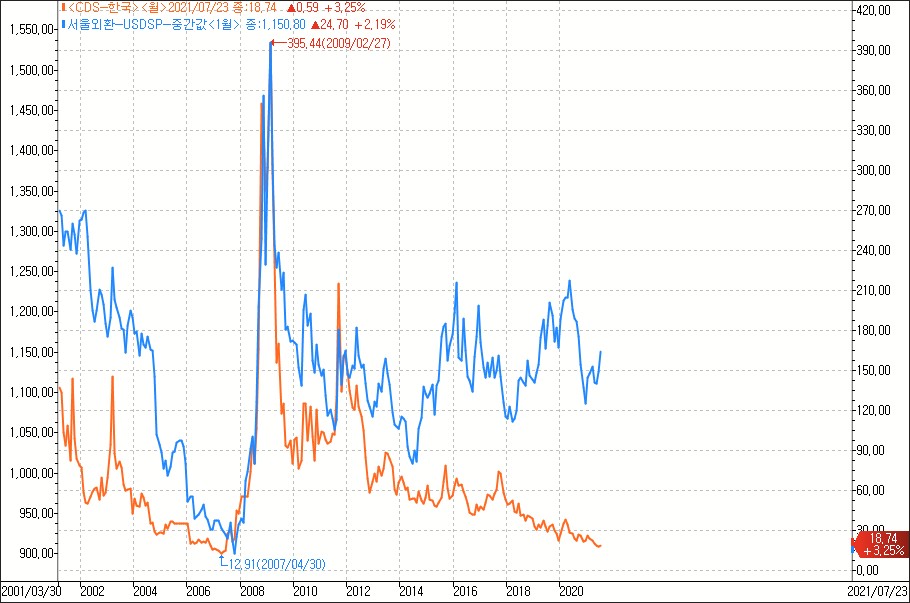 아래 그림파일은 CDS5년물 가격입니다. (파란색 달러원, 주황색 CDS, 월봉차트) 현재 CDS는 18.7bp로 2007년 12.91bp이후 최저치를 기록중에 있습니다. CDS금리가 달러원 환율과의 85% 상관관계를 갖는 대외건전성지표임을 감안하면 상당히 안정적으로 관리되고 있어 중장기적으로 달러원 환율 상승을 제한하는 요인이 될 것으로 보여집니다.