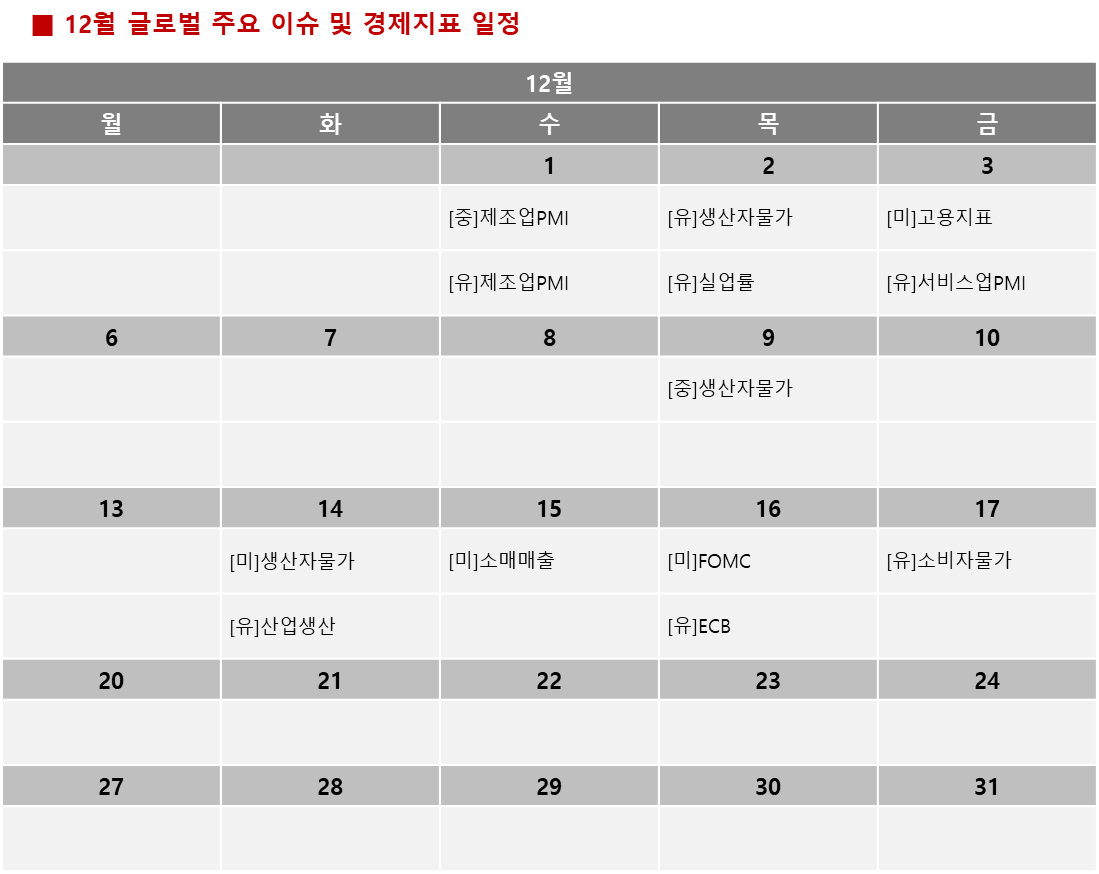 이번달 주요이벤트는 12.15일 FOMC에서 연준의 스탠스가 주요해보이며. 15일 미 부채상환 한도설정 시한이 재차 도래함에 따라 시장 변동성을 키울 수 있어보입니다. 또한 잠잠했던 헝다그룹의 부채상환이슈가 12월 말에 또 생길 수 있어 12월 수급이 적어진 상황에서 위아래 변동폭이 커질 수 있는 점이 리스크로 보여집니다.