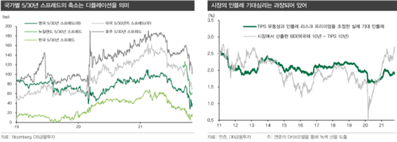 초장기 채권은 강세. 5/30년 스프레드 축소세 -> 인플레 가능성 낮게 보거나 통제가능 기대