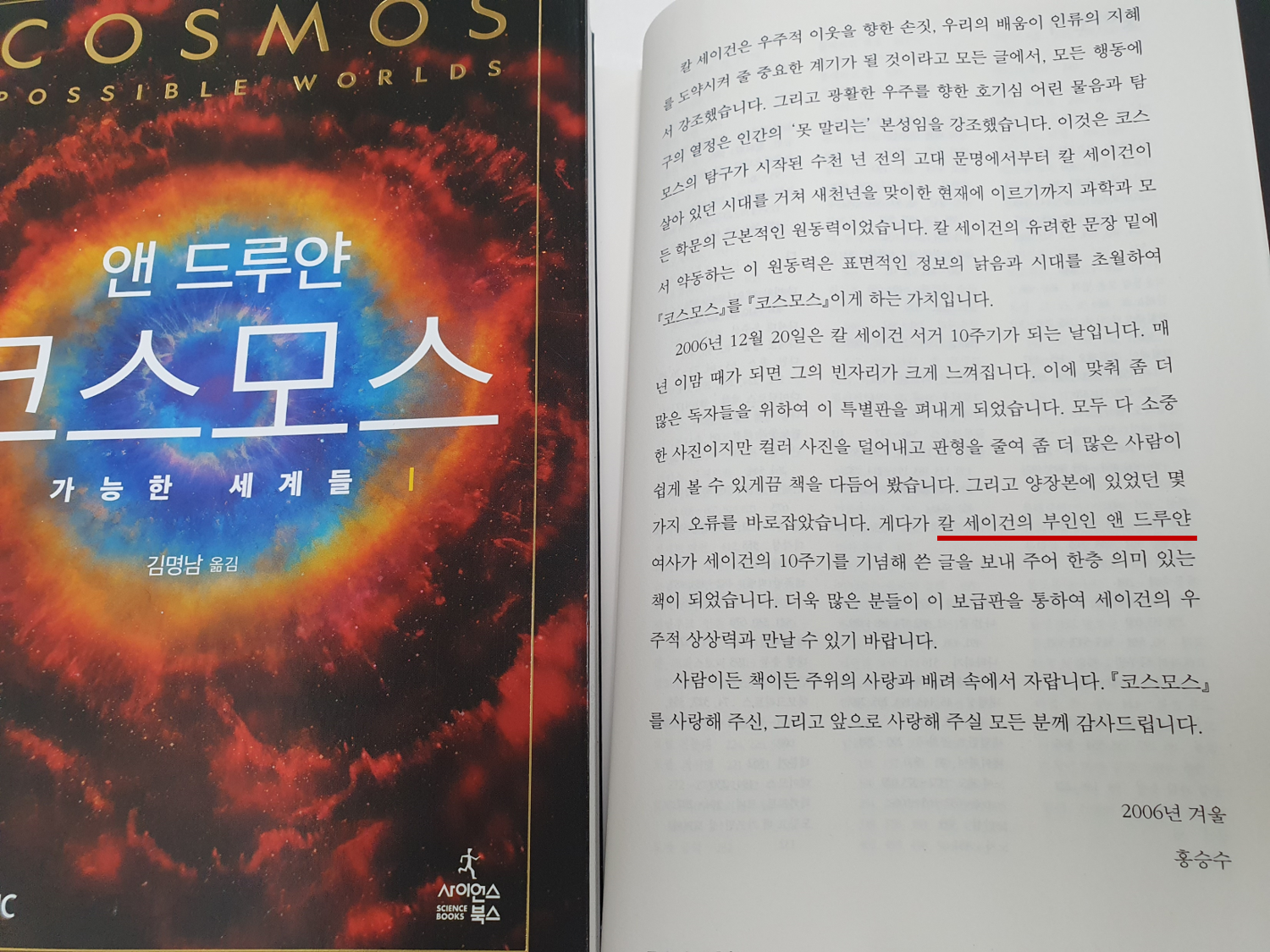 (칼 세이건의 코스모스 책장 마지막에 쓰여있는 부인. 앤 드루얀 여사 이야기에 흠칫... 후속작 코스모스가 부인이 쓴 책이였구나!!)