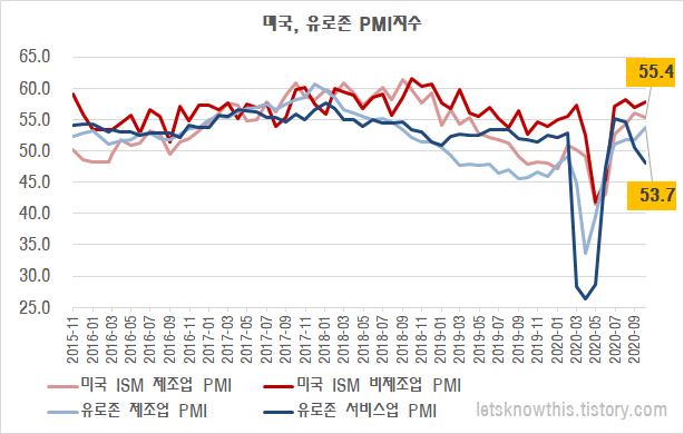 미국 제조업PMI지수는 유로존보다 늦은 2019년 8월부터 50을 하회하였으나 2020년 10월달 발표지수는 55.4로 발표되며 경기가 회복하고 있음을 나타내고 있습니다.