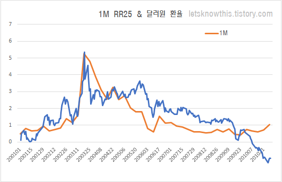 국내는 통화옵션시장의 현물과 선물환시장에 비하면 크지 못하고, 달러원 환율은 양국간 금리차나 지정학적 리스크, 외부 변동요인들에 큰 영향을 받는 구조이기에 리스크리버설로 방향성을 설명하기에 다소 부족한 점이 있으나 달러원 환율을 움직이는 다른 요인들과 함께 고려대상이 될 수는 있어보입니다.