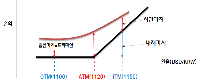 예) 시장환율 1100원일때 1000원에 1년 후 팔 수 있는 권리 가격은?? '0'이 아니라 시간가치가 조금 있어 옵션의 가격이 존재합니다.