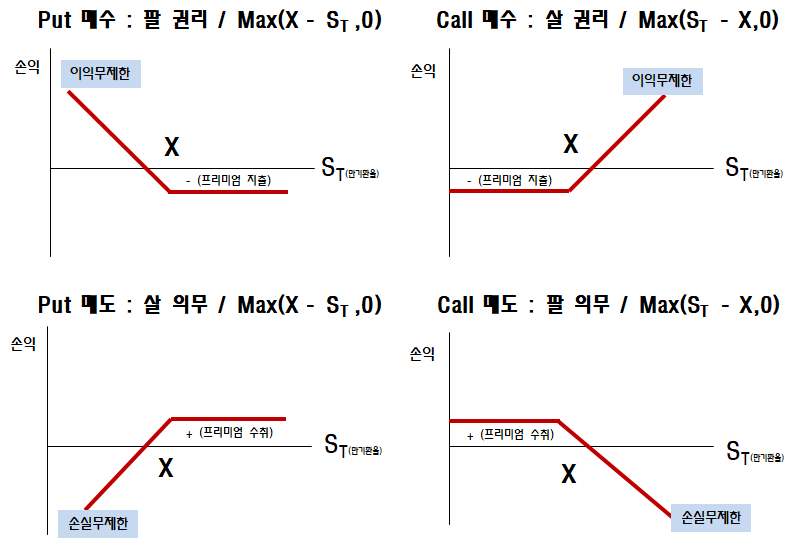 예1) 동일한 행사가격 X를 갖는 Call옵션 매도 + Put옵션을 매수하면... X 행사가격을 갖는 합성선물환을 만들 수 있습니다.