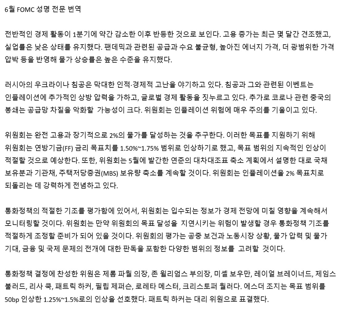 개인적인 소견으로 블랙아웃 기간에 데이터를 확인한 상황에서 75bp금리인상은 무리지 않을까 싶어 50bp인상 후 7월 75bp인상가능성은 언급할 경우 달러원 환율이 1270원 초반수준으로 급락가능성도 기대하였으나. 파월의장도 기자회견에서 블랙아웃 기간에 데이터를 확인하고 시장참가자들 기대도 75bp에 머물러 10대 1의 찬성으로 75bp 금리인상을 할 수 있었다 발언하였습니다.