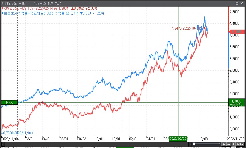 달러원 환율은 역외에서 최종 1424원으로 호가되며 저점대비 17원 상승하는 약세흐름을 보였습니다. 연준이 75bp금리인상을 하며 한미간 기준금리차만 1%가 나는 상황이고 10년물 국채금리는 미국 4.1047%, 한국 4.1350%로 큰 차이가 없는 상황이 되었습니다. 지난해 70~80bp 차이가 나던 10년물 국채금리 스프레드가 축소되며 채권자금이탈에 대한 우려도 커지고 있는 것으로 보여집니다. 또한 미증시약세에 따른 글로벌 위험회피심리도 커질 수 있어 외국인 증권자금 유출에 따른 원화의 추가약세 가능성이 커지고 있는 것으로 보여집니다.