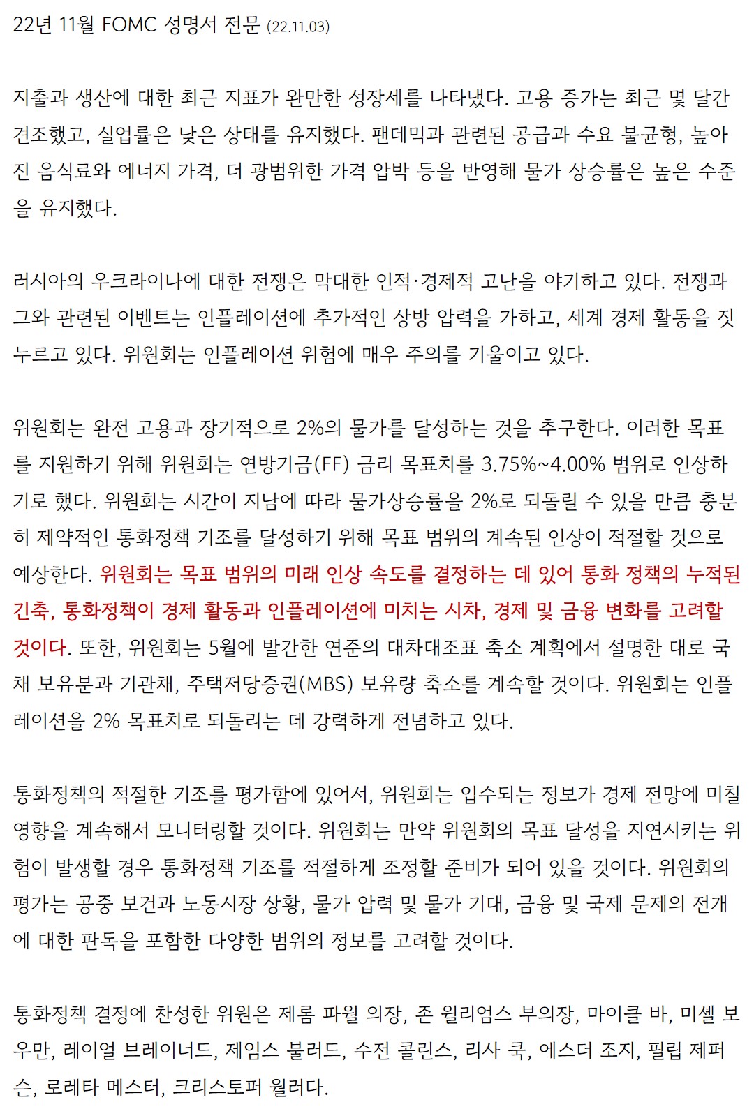 이로써 미 기준금리는 3.75~4%로 상승하였으며 12월 50bp금리인상으로 속도는 조절될 것으로 보이나 그보다는 최종금리수준이 5% 이상으로 높아진 상황입니다.