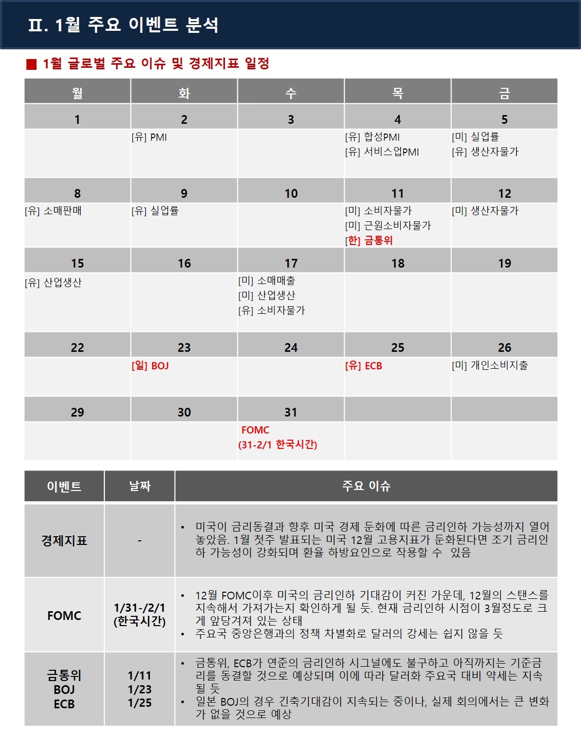 1월 주요 이벤트로는 중순 유럽 ECB, 일본 BOJ 등 주요국 중앙은행들의 통화정책이 예정되어 있으며 1월말 FOMC를 앞두고 주요국들의 경제와 물가에 대한 평가가 시장을 움직일 재료로 판단됩니다.