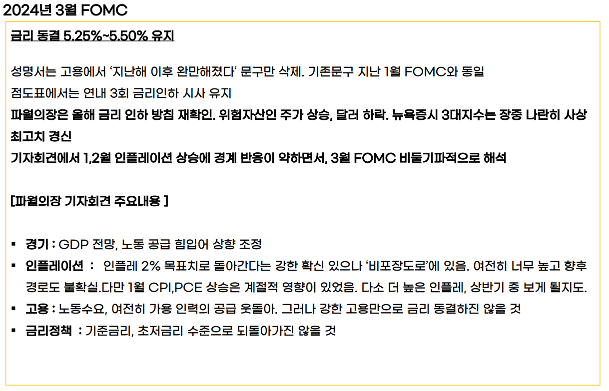 금일 새벽 발표된 FOMC에서는 금리를 동결했습니다. FOMC 전 1,2월 물가가 예상치를 상회하면서 연준에서 금리인하 횟수를 기존 3회에서 2회로 낮출 가능성에 달러원 환율은 상승하기도 했으나, 점도표에서는 기존 3회 인하 경로를 유지했습니다. 이에 6월금리인하 가능성이 급등했습니다.