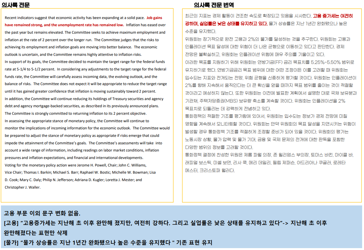 성명서에서는 고용이 지난해 초 이후 완만해졌다는 내용이 삭제된 것 이외에 변경된 부분은 없었습니다. 미국 경제는 조금 더 견고할 것으로 전망했으며, 근원물가는 소폭 상승할 것으로 전망했습니다.