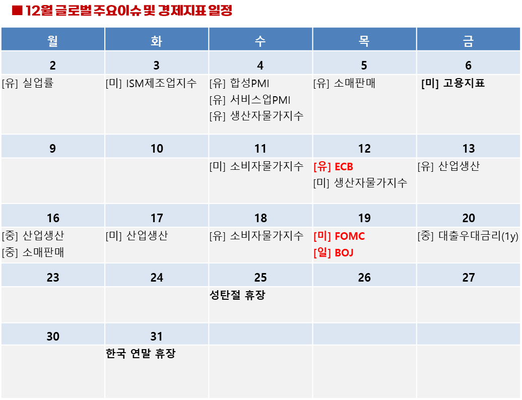 가장 주요한 이벤트는 19일 FOMC와 BOJ의 미국과 일본의 통화정책회의입니다. 12월 FOMC에서 25bp금리인하 가능성은 60%수준이나 내년 1월 금리인하 가능성은 17%로 집계되고 있어 연준의 금리인하 속도가 제한될 것으로 보이며 BOJ에서는 물가상승에 추가금리인상이 진행될 것으로 예상됩니다. 이에 통화정책만 놓고보면 달러약세요인이나 1월 미 트럼프 취임을 앞두고 하락세 또한 제한될 것으로 전망하고 있습니다.