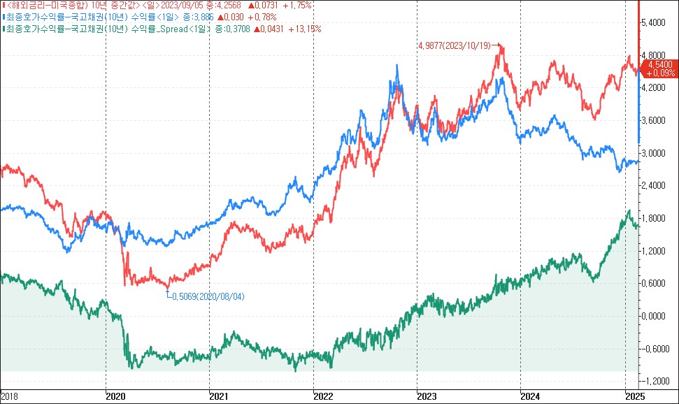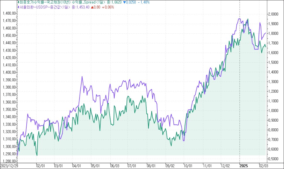 아래 1번 그림파일은 25.02.12기준 한국 미국 10년물 국채금리와 스프레드(녹색음영부분)를 나타낸 차트입니다. 2번 그림파일은 2024년 이후 달러원 환율과 한미금리차를 나타낸 차트입니다. 현 시점에서 외환시장에 가장 큰 영향을 주는 매크로 지표로 10년물 국채금리를 보고있어 참고하실 수 있게끔 첨부드립니다.