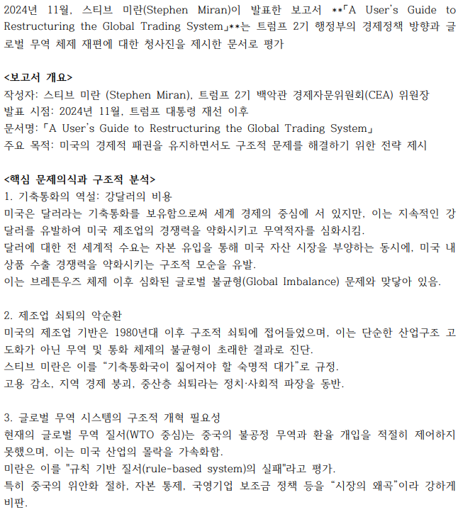 아래는 트럼프의 관세지침이 되었던 24.11월 발표한 백악관경제자문위원 스티브미란의 41페이지 보고서를 요약한 내용입니다. 저 보고서대로 점진적인 관세정책을 진행했다면 현재와 같은 금융혼란은 없었을 것으로 보이나 강경파의 주문대로 발표되어 금융위기 전단계까지 갔다 온 것 같습니다. 아래 자료는 요약본이며 원문 필요하시면 요청해주시면 전달드리겠습니다.