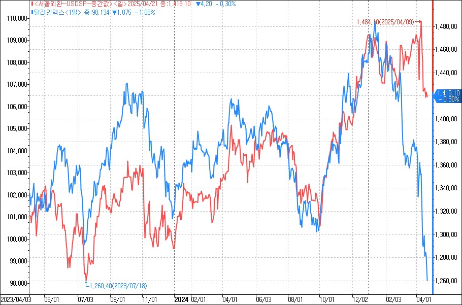 원화가 달러인덱스에 동조되지 못하는 이유는 한미간 금리차이가 벌어지는 부분, 트럼프 관세정책에 글로벌 경기둔화우려에 따른 한국의 경제성장률 감소 우려, 위험회피심리에 따른 외국인 자금유출, 위안화 눈치보기 정도로 파악됩니다. 국내 정치적 불확실성과 4월 외국인 배당금지급 등 국내요인도 있으나 이보다는 대외이슈가 더 커보입니다.