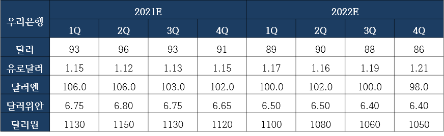 5. 따라서 달러/원은 연초 수출 부진 소식과 바이든 통상정책에 대한 재평가, 미중 갈등 지속 등 영향에 반등한 뒤 연말까지 1,110~1,140원을 중심으로 횡보하는 그림을 예상