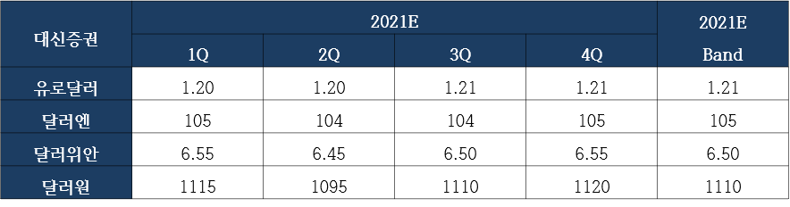 큰 틀에서는 2분기 저점 형성후 3~4분기 달러원 환율 약세로 상승하겠으나 그마저도 소폭 상승에 그칠 것으로 보여 분기평균 환율 범위가 1095원~1120원으로 25원 수준으로 전망치를 발표하였습니다.