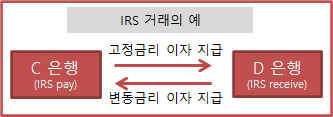 C은행은 CD금리로 돈을 빌렸을 때, CD금리가 변하면 이자를 더 많이 내야 할 수도 있으므로, C은행은 안전하게 고정금리로 내기 원함. 이럴 때 이자율스왑을 이용하면 이자율을 고정할 수 있음. 이렇게 고정금리 이자를 주고 변동금리 이자를 받는 이자율스왑을 IRS pay 라고 함. (IRS receive는 반대)