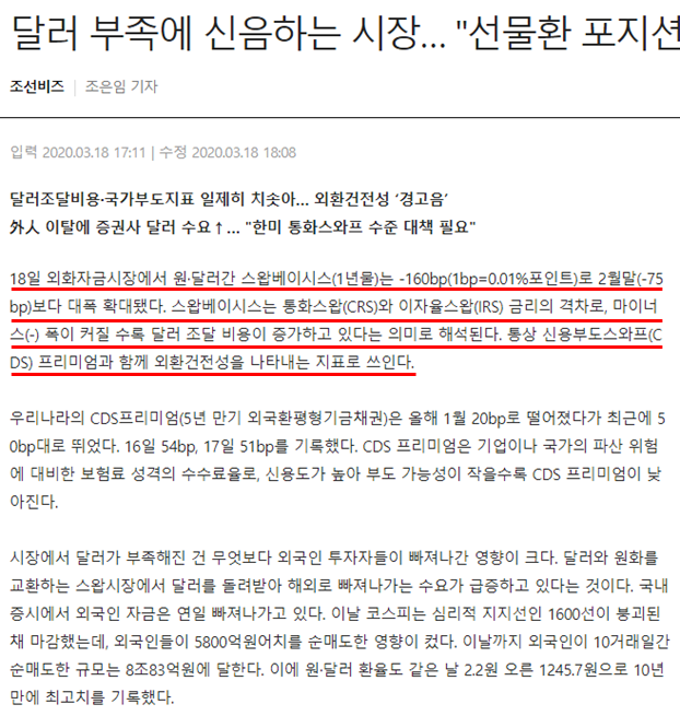 20년 3월 18일. 달러수요 상승으로 CRS 금리가 폭락. 환율 상승. 스왑베이시스 큰 폭의 마이너스.