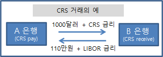 A은행이 1000달러가 있고, B은행이 110만원이 있다면, 환율을 1달러 = 1100원으로 정하고 1년간 1000달러와 110만원을 맞교환함. 그리고 서로 돈을 빌린데 대한 이자를 교환해야 하는데, A은행은 B은행 측에 CRS 금리만큼을 내고, B은행은 A은행에 LIBOR 금리 만큼을 지불함.