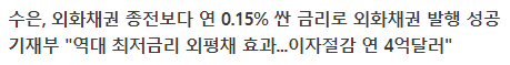 기재부는 수은이 저금리로 외채 발행에 성공한 수 있었던 것은 지난 10일 정부가 14억5000만달러 규모 외평채를 역대 최저금리로 발행한 덕분이라고 설명했다.