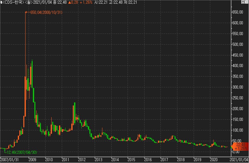 * 2008년 금융위기당시 650bp까지 급등. 국가부도위험에 대비해 지불해야하는 보험료가 6.5%
