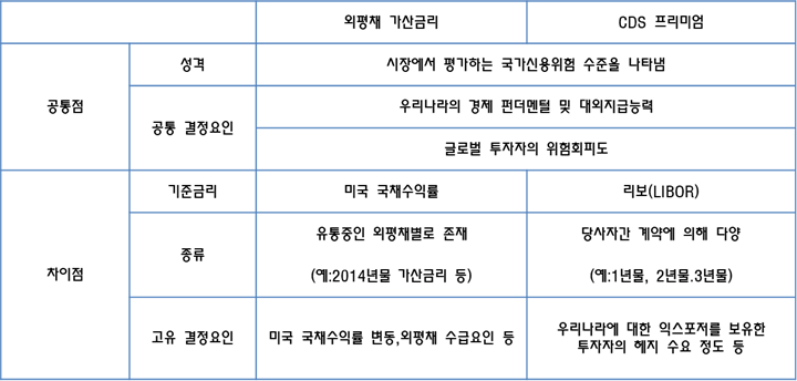 CDS 프리미엄과 외평채 가산금리 모두 경제 펀더멘털이나 대외 지급능력과 글로벌 투자자의 위험 회피도를 반영함.