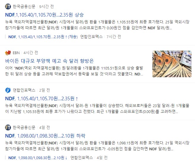 전일 뉴욕 역외시장에서 마감된 달러/원 NDF 환율(특히 종가)의 경우, 1개월 스왑포인트를 감안해 국내 외환시장 개장가를 가늠할 수 있으므로 중요한 지표로 이용됨.