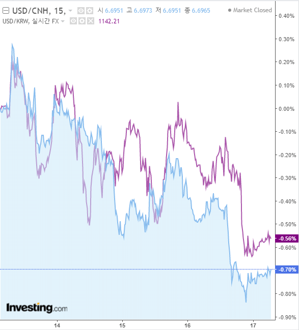 다만, 전일 달러가 강세에 대한 되돌림을 보이며 약세로 움직인 점. 중국 위안화가 내수소비를 중심으로 경기회복이 뚜렸하다는 평가 속에 6.7위안을 재차 하향 돌파한 점으로 역외 달러원 환율은 1143원까지 하락하였습니다.