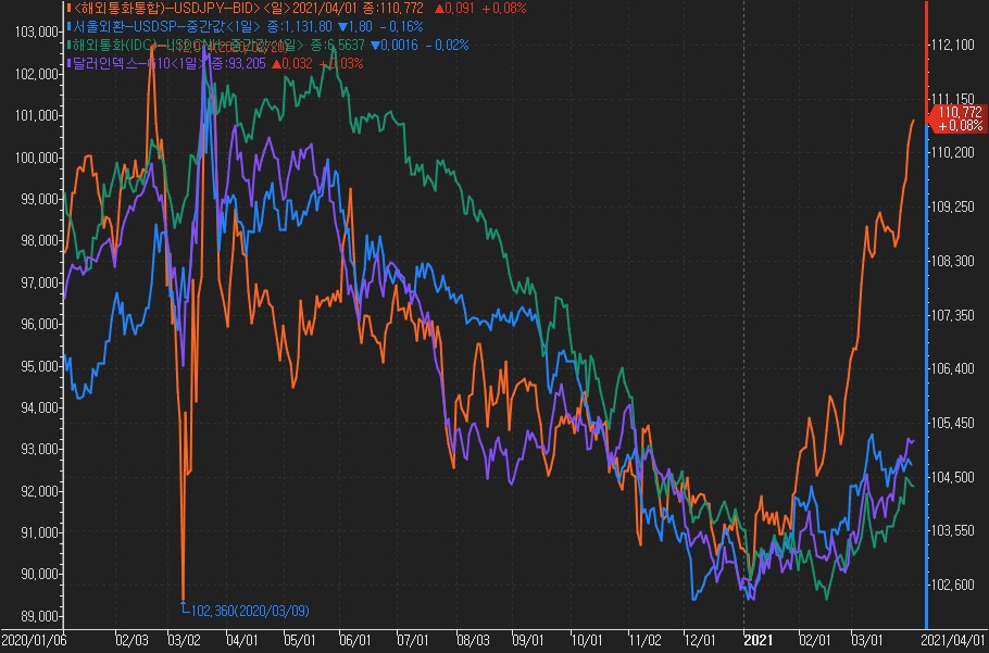 일본 엔화는 대외순자산국으로 글로벌 위험선호심리의 큰 영향을 받는 통화 중 하나로 미국을 필두로한 경기회복과 달러강세부분을 가장 크게 반영하고 있습니다. 이와 대조적으로 유럽, 일본, 캐나다 등 주요국들은 백신공급이 원활하지 않아 미 달러대비 약세폭이 큰 것으로 보여집니다.