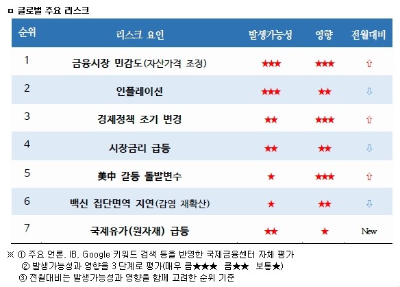 아래 그림파일은 국제금융센터에서 발표하는 글로벌 주요 리스크표입니다. 주요언론, IB, 구글 키워드 검색을 반영한 평가표입니다.