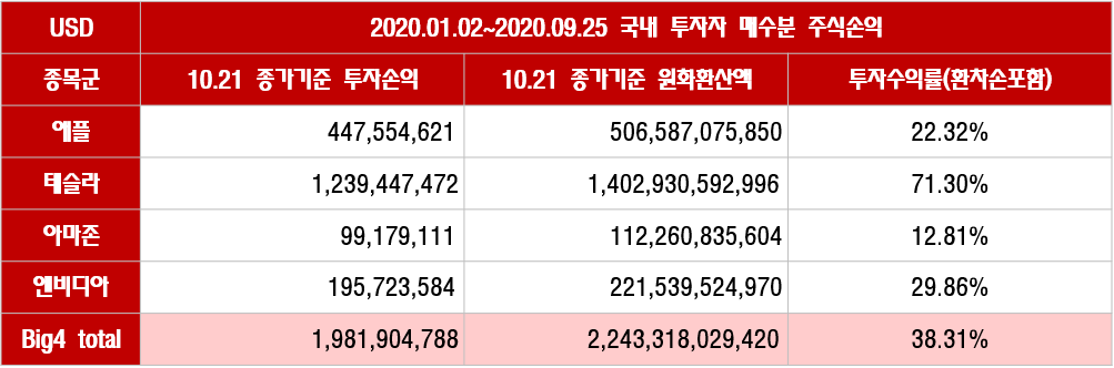 국내투자자들이 애플주식을 가장 많이 샀으며 1.2일부터 9.25일까지 20억불가량 매수하였으며 Big4 전체 51억불을 넘는 금액을 매수하였습니다.
