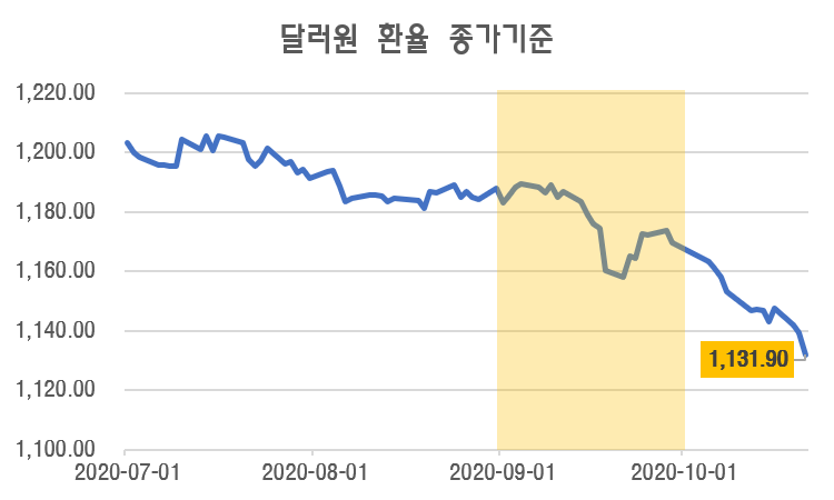 달러원 환율은 올해 10.21일까지 연평균 1200.77원이며 가장 많이 매수했던 시기인 9월 평균환율은 1177.65원이였습니다. 이후 위안화와 동조화를 보이며 원화도 급격히 하락하였으며 10.21일 종가 1131.9원을 기록하며 19개월내 최저치를 경신하였습니다.